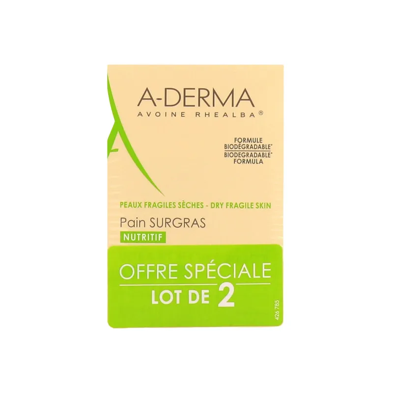 Aderma Pain Surgras Lot de 2 x 100 g à l’avoine rhealba d’origine biologique nettoie, nourrit, protège le visage et le corps de toute la famille. Idéal pour les peaux sèches, il respecte le film hydrolipidique cutané et laisse un film protecteur très confortable.